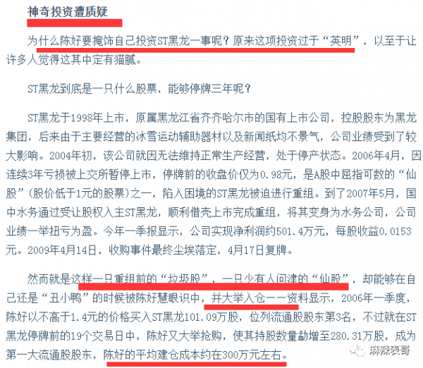 三年后,ST黑龙复牌,突然一下就涨了十倍,陈好作为第一大流通股东出手,300万变成3000万,净赚2700万。