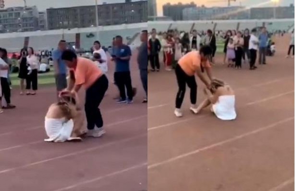 仅仅一个回合,双方因为体重上的巨大差异便是导致战局一边倒,女子因为不敌大妈,直接被摁倒在了地上。