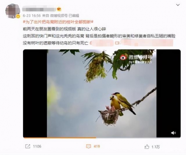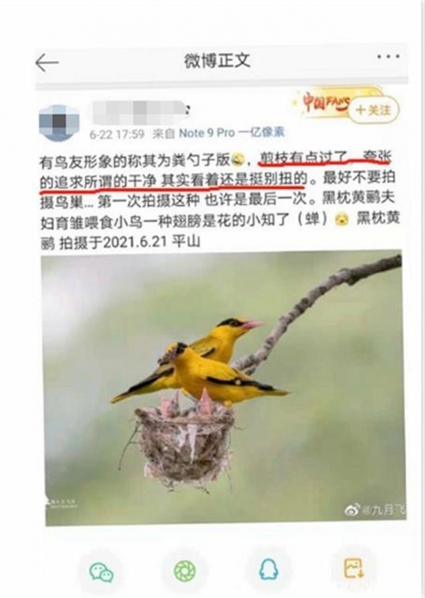 此外,极目新闻记者还在网上看到一段与上述图片场景较为一致的视频,视频中一对黄鹂鸟衔食归来,它们晃悠悠地站在“光秃秃”的树枝上,喂食几只幼鸟,让人不免揪心。而与此同时,视频的背景音则是一阵阵“猛”按的快门声。这两只成年黄鹂也似乎对人们的拍摄有所警觉,不停张望。发布该视频的网友配文称,“这刺耳的快门声和这光秃秃的鸟窝背后,是拍摄者畸形的审美和修巢者自私丑陋的嘴脸,没有树叶的遮蔽,等待幼鸟的只有死亡。”