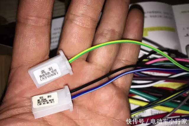 电动车刹车断电的装置一般分两种,一种是高刹,一种是低刹,其中高刹的信号线一般为黄绿双色,低刹的信号线为蓝白双色,不过低刹多了一根黑色的地线,按照这个颜色,对应自己的电动车拔线即可。
