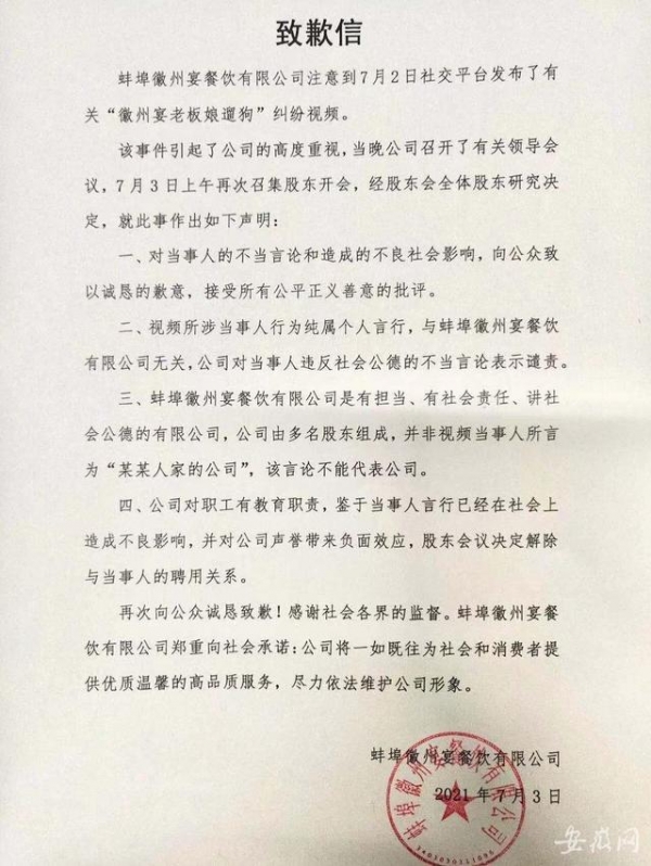 从注册信息上可以得知,徽州宴是蚌埠当地一个知名高档连锁酒店品牌,旗下有多家酒店。公司全称为蚌埠徽州宴餐饮有限公司。7月3日,网上又出现一份署名蚌埠徽州宴餐饮有限公司的致歉信。该致歉信称,当事人的行为纯属个人言行,和公司无关,公司对其不当言论进行谴责,为此向公众道歉,并已解除和当事人的聘任合同。