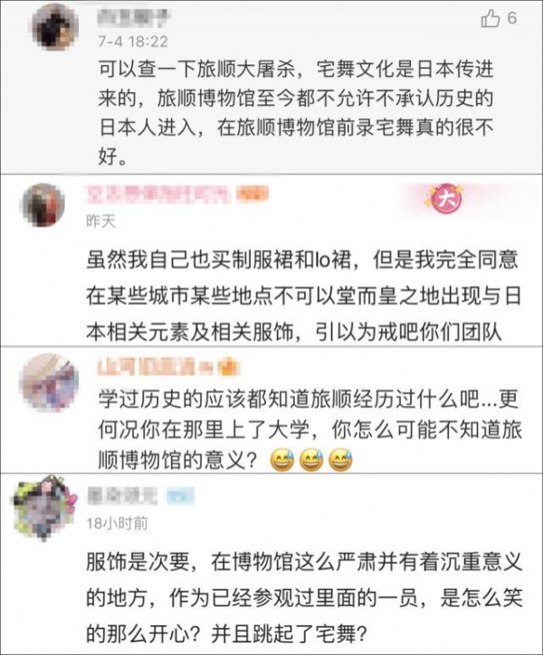 网友认为,@机智的党妹 在旅顺这样一个见证了日军暴行的地方,选择在旅顺博物馆门口,穿着受日本影响的服装,欢快地跳着与日本文化有关的宅舞,实在不妥。
