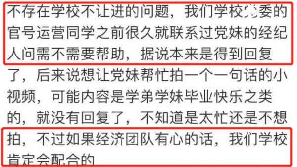 包括党妹母校方相关运营人员也表示,很早之前就联系过党妹的经纪人询问是否需要帮助,根本不存在学校不让进的问题,党妹道歉声明中无法进入高校的情况似乎也并不属实。