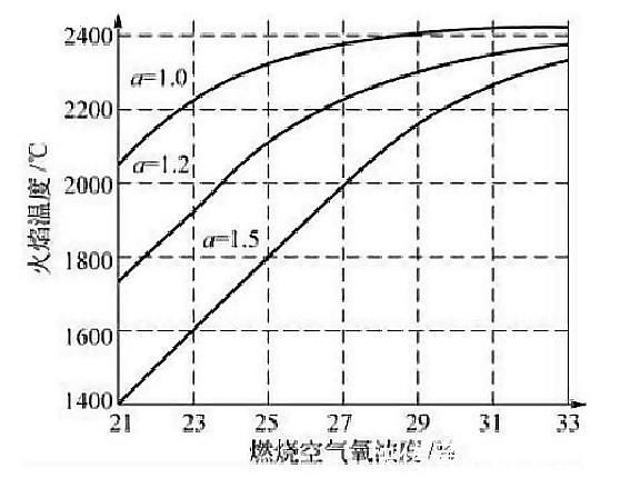 (增压器可以提升进气氧浓度,常压标准氧浓度为21%,下图为升高后的燃烧火焰温度变化曲线)