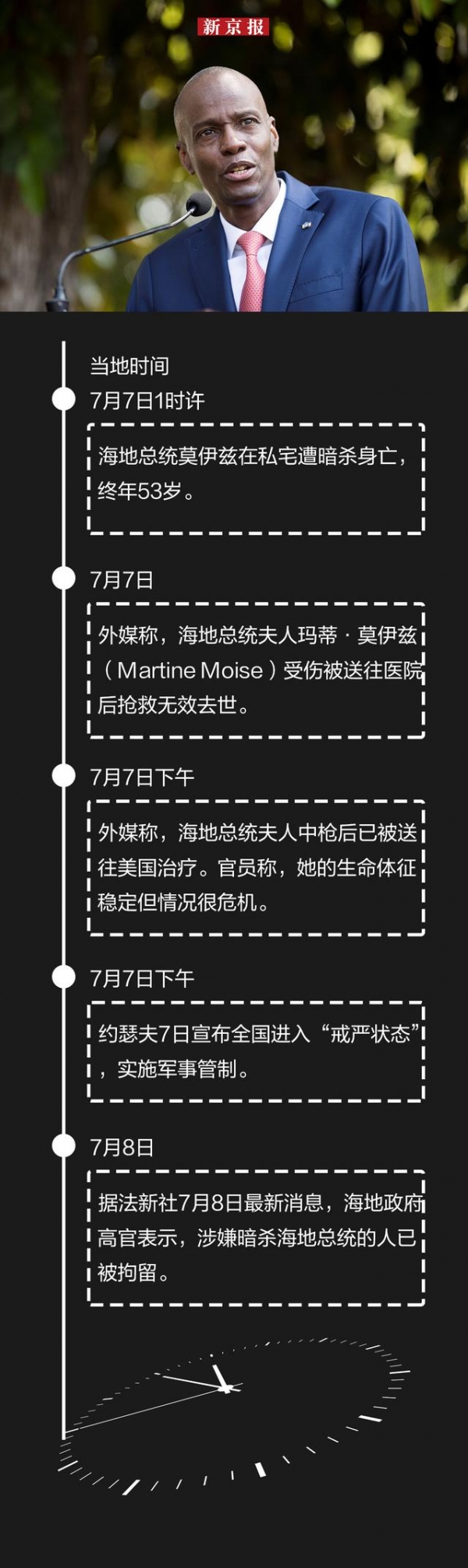 约瑟夫7日宣布全国进入“戒严状态”,实施军事管制。此外,海地从7月8日至22日全国哀悼15天。