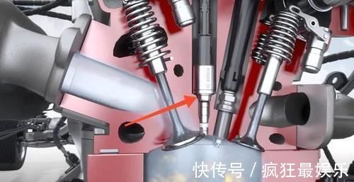 缸内直喷顾名思义就是把汽油直接喷射到气缸里,利用高压油泵提高压力,在吸气冲程进气门只进空气,汽油从缸盖上的喷油嘴直接喷入气缸。 比如上图红色箭头所指的就是高压喷嘴。