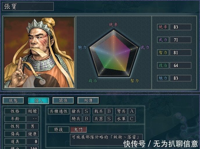 黄巾贼的二号人物,自诩"地公将军"。或许是黄巾贼一直被视为杂乱无序的农民武装暴动,但是里面可挖掘的人才可不少,张宝就是可以深度培养的一号武将。鬼门这个特技就不用多说了,也是游戏里唯二拥有此特技的武将之一。战斗三围数值尚可,且还有枪和兵两个 S 级的适性,武力稍加培养就是一个可以独自出战的全面性人才。