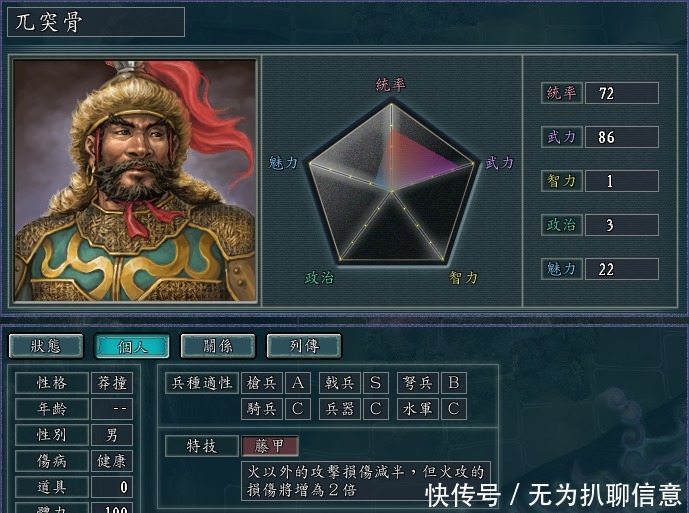 游戏中智力最低的武将,没有之一了!只所以提及他,就是因为他独一无二的特技藤甲,论拿"菜刀"两方部队对砍,相信没有几个武将能够胜过此武将。天生弱智也不是什么大事情,反正不论智力是1还是69,凭借这个特技的说明都要给他配备最好的计谋之士。如此一来加上戟兵 S 适性,只要敌方不用火种和火球来打,兀突骨就能把敌方搅和的天翻地覆。