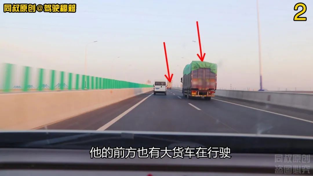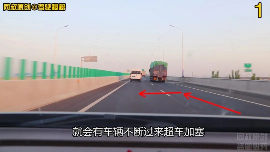 现在正处在一段小上坡路段,右侧一辆大货车,他的前方也有大货车在行驶,满载的大货车对于上坡路段比较敏感,左侧车道正常应该快于右侧车道。
