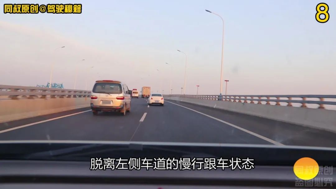 打右转灯,观察右侧后视镜以及右侧车窗外,确认安全后向右变道,脱离左侧车道的慢行跟车状态。
