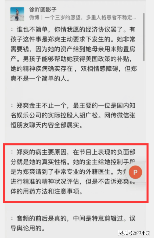而能让冯小刚如此发文的,估计不是小人物了。随着事情的发酵,郑爽自身的问题也引起了大家的关注。但凡正常人,怎么能干出这种事情?郑爽是不是有病?或许还真的有!有网友还曝出郑爽疑似精神上面有问题,金主还从国外特地给她找了医生,这也可以解释为何郑爽经常在节目上发疯了。
