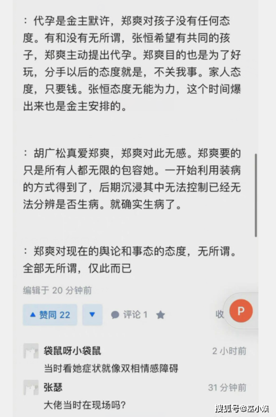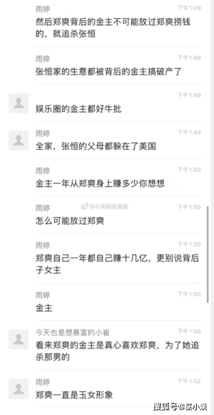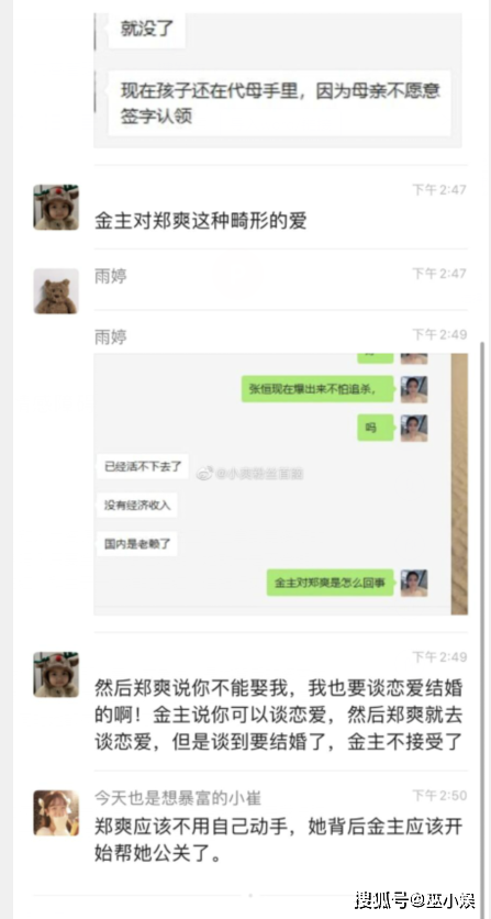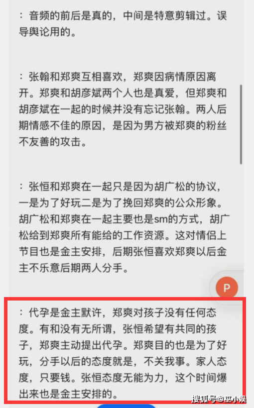 有网友曝出, 郑爽代孕这事扯出了金主,金主还不止一个,郑爽之前和张恒在一起是金主同意的 ,而且郑爽代孕还是金主默许的。郑爽和金主之间是有协议的。而且郑爽的金主还有sm癖好,金主能给到郑爽工作上很多资源,而郑爽和张恒一起参加情侣节目也都是金主安排。