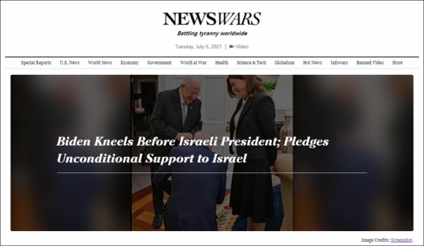这张照片很快在社交媒体疯传,美国著名的阴谋论者亚历克斯 · 琼斯(Alex Jones)创办的新闻网站 "Newswars" 刊登了相关报道,标题为:" 拜登跪在以色列总统面前,承诺无条件支持以色列。"