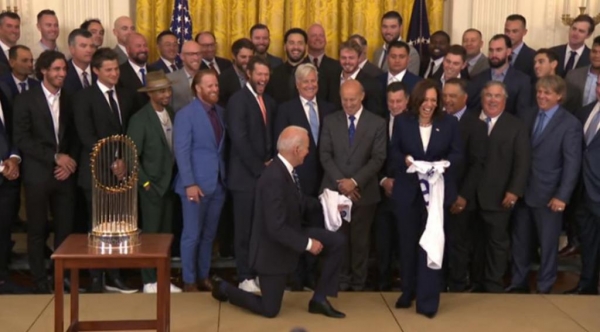 当地时间 7 月 2 日,拜登在白宫接待了 2020 年世界棒球大赛冠军获得者洛杉矶道奇队。在全场合影时,拜登突然下跪,惊到现场众人。美国副总统哈里斯只能大笑掩饰尴尬,并且急忙站到拜登身后。一些美国网民调侃称,拜登是在向哈里斯 " 求婚 "。