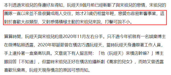 据台媒独家联系到宋祖儿身边友人,对方称宋祖儿阮经天已经情断8个月(推算日期应该在去年11月份),给出的原因是宋祖儿团队一直不希望他们走到一起。