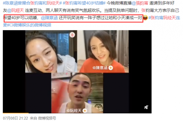 首先前段时间阮经天与张钧甯、陈意涵连线直播,三人私交甚好。