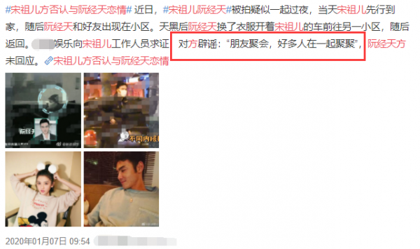 2020年初阮经天被拍现身宋祖儿小区,期间阮经天还换了一套衣服,开着宋祖儿的车外出,被传恋情后宋祖儿工作人员辟谣,只是好友聚会,甚至有工作人员调侃自己也在场,为何不拍拍她。
