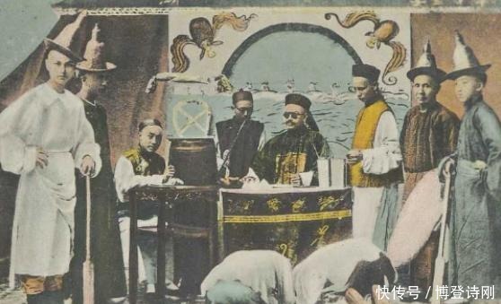 图为晚清县太爷断案现场。这张照片将晚清社会阶层差别展现的淋漓尽致,县太爷、师爷、衙役等人高高在上,而犯人跪在地上连头都不敢抬起来