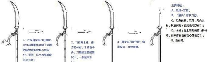 苗刀:非苗族用刀,而是因刀身形状似禾苗而命名。民国时期定名,此前为双手刀,最早起源于汉代,兼具刀、枪两种兵器的特点,可单、双手变换使用。明朝时期借鉴倭刀刀法创制《单刀法选》用以抗倭。苗刀刀长三尺八寸、靶长一尺二寸,总长有五尺。形状跟倭刀很像,区别在于装具风格不同,苗刀刀尖无明显的帽子、手柄一般无缠绳、无目贯。