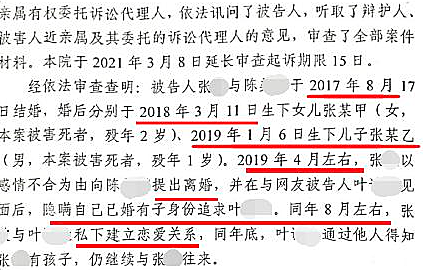 但叶某曾多次表示其与父母不能接受张某有孩子,去年2月,张某叶某两人多次面谈及微信聊天共谋敲定采取意外高坠杀害两个小孩。同年11月1日,张某趁其母不在家之时将两个正在玩耍的孩子从次卧飘窗窗户扔下了十五楼。