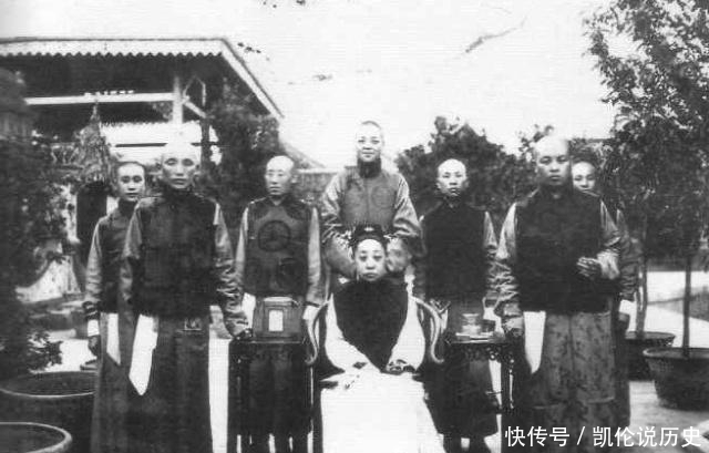 左右两边的太监一个是崔玉贵(这个人,以后的珍妃投井事件,就是他干的),一个是李莲英(我也不知道究竟哪个是哪个,也许右边的是李莲英?),两人长的都很猥琐…话说古代选太监的标准到底是怎么样的啊喂……这俩货也忒磕碜了……