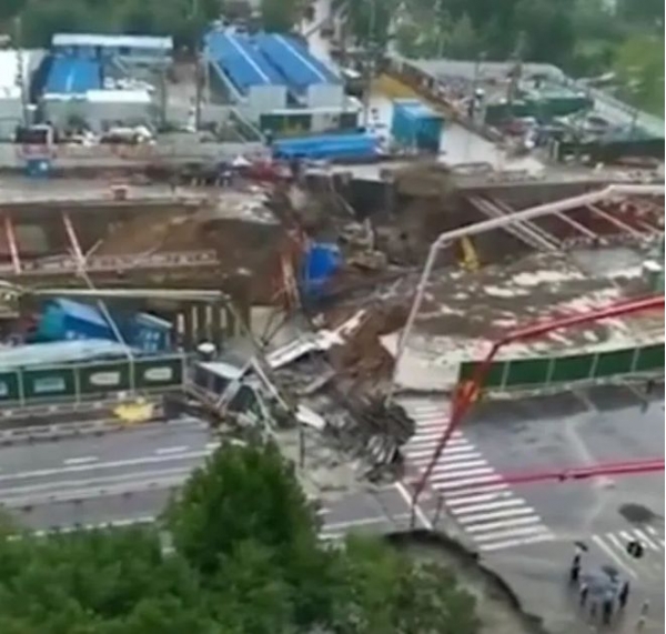 郑州市应急管理局工作人员回应称,塌方系雨量太大导致自来水管爆裂,水冲垮了在建的车展基坑引起,已第一时间派郑东新区应急局赶赴现场救援。