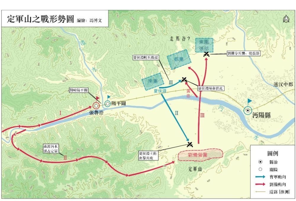 在这个过程之中,阳平关和定军山的军事地理价值展露无遗,但它们也仅能在某一个具体的军事格局之下才能够呈现出自身的价值。曹军与刘军沿濜水东西对峙之时,由于沔水河谷狭窄,刘备大军只能汇集于阳平关一点,全军根本无从展开,阳平关当之无愧成为枢纽之地。正因为此,刘备军只能通过转换方向来打破由阳平关锁定着的军事格局,那就是南渡沔水、袭占定军山。备军通过此举迅速将两军东西对峙、焦灼于一点的格局,转换为南北对峙、战场形势宽阔的新态势,为本军的展开、调遣和突袭创造了条件,同时威胁到了原本汇聚于阳平关的曹军后路,夏侯渊被迫调整阵营,沿北山一字布置营垒,这又为刘备能够分头袭扰、围点打援提供了便利。其实,相较于阳平关而言,定军山的军事地理价值要弱一些,因为它最大的功用是帮助刘备军在沔南站稳了脚跟,使其有空间北进突击。换言之,使曹刘易势的要素并非一座山,而是刘备选择进军沔南的军事行动本身。
