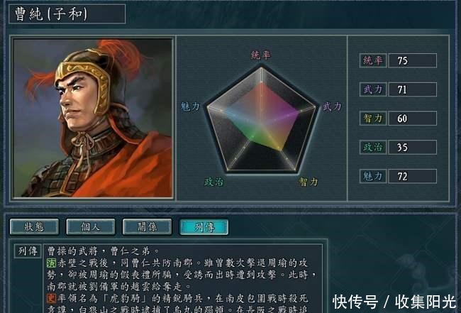 在徐晃之后,归降曹操的张辽、张郃也全都是擅长率领骑兵的将领,因此曹仁除了徐晃又多出了两名竞争对手。与此同时,曹仁的弟弟曹纯也在这时期成长起来,担任曹操军中最精锐的骑兵--虎豹骑的统领。曹操军中一下拥有了五大骑将:曹仁、张辽、徐晃、张郃、曹纯。而在这曹营五骑将全部聚齐之后,曹仁便基本便没有了功绩。通过史料可以发现,从官渡之战结束到平定河北期间,曹仁虽跟随曹操出征,但其唯一的功绩便是在曹操围攻壶关时劝说其不要屠城,并因此功被封为都亭侯。这是曹仁首次封侯,而早在官渡之战时期徐晃、张郃等人都已经受封都亭侯。在平定河北、远征乌桓的过程中,张辽升迁最多,从中郎将升迁为荡寇将军,封都亭侯。张郃升迁为平狄将军、徐晃升迁为横野将军,其军职都超过了曹仁。而虎豹骑统曹纯虽然军职仍在曹仁之下,但也因功封为高陵亭侯,爵位在曹仁的都亭侯之上。