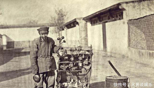 晚清百姓生活珍贵老照片:当时的小贩都是挑着一个担子,到街上贩卖自己的东西,图为一个老人正在街上售卖自己手工做的工艺品。