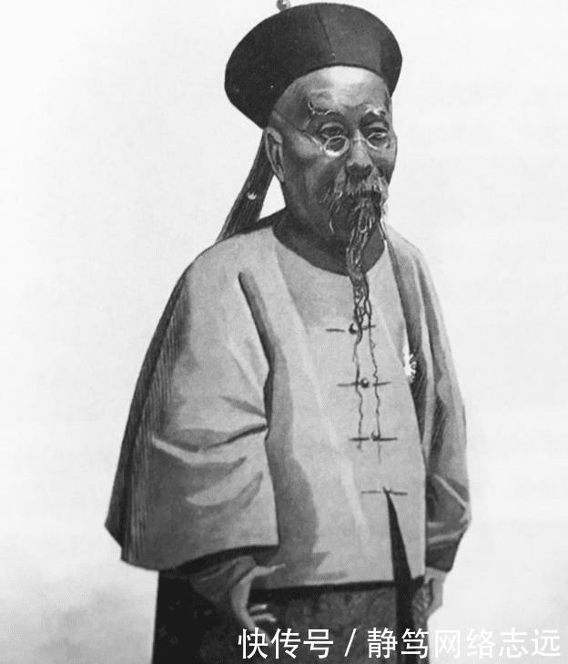 这张照片是1896年英国报刊为李鸿章画的漫画图,画中的李鸿章穿这个黄马褂,戴着个眼睛,手指还呈弯曲的样子。