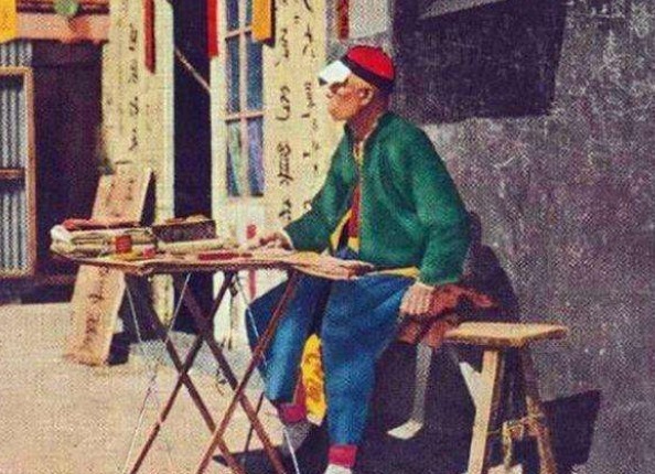 这组照片拍摄于清朝末期,是由一位外国人拍摄的,后期上色的彩照,照片中是当时算卦的摊位,在封建时代算命先生还是很吃香的。
