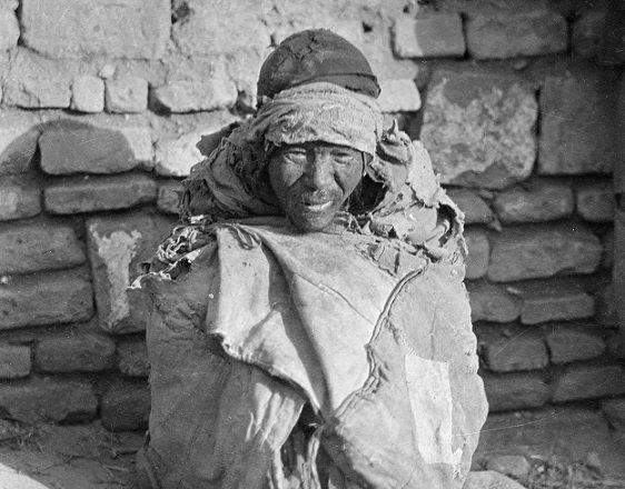 清朝时期,在寒风中发抖的乞丐。蓬松的乱发、衣衫褴褛、漆黑的面庞,乞丐可以随便在街市上叫讨,随处募化钱物。