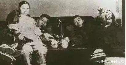 黄自然和毒离不开,这是青楼女子在陪两位客人吸食鸦片,喝茶,聊天的情景。