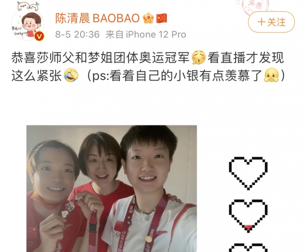 不过这么宝贵的徽章,孙颖莎也不小气,昨晚打完团体赛就换给了关系特别好的羽毛球队队员,C语言大师lucky姐陈清晨。