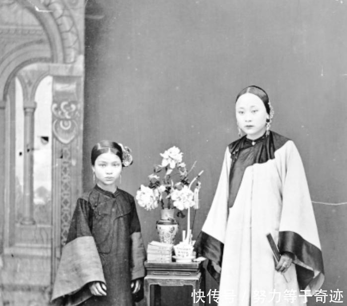 这是晚清年间一对有钱人家母女的合影,其身后的房屋非常高耸巍峨,非常的气派。