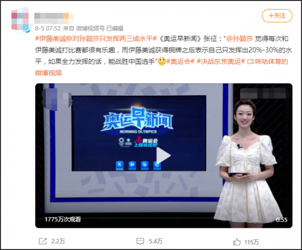 乒乓女团比赛开始之前。网络上流传着伊藤美诚自称“只发挥出两三成水平”,“如果发挥全力的话可以战胜中国选手”的报道。还有一些自媒体、加V微博号称“伊藤美诚扬言要在团体赛复仇”。