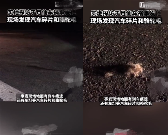 目前,车祸现场已经被打扫了,于月仙发生车祸的车辆已经不在现场,撞死的骆驼也已经被拉走,但是现场仍能看到清晰的刹车痕迹,以及散落在地上,随处可见的汽车碎片和骆驼毛。