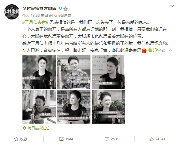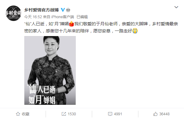 于月仙的不幸离世,让很多网友悲痛不已,《乡村爱情》官博更是连发两篇动态悼念,《乡村爱情》在官博中写道:“我们敬爱的于月仙老师,亲爱的大脚婶,乡村爱情最亲密的家人,感谢您十几年来的陪伴,愿您安息,一路走好”“一个人真正的离开,是当所有人都忘记她的那一刻,我相信,只要我们铭记在心,大脚婶就永远不会离开,大脚超市也永远留着大脚婶的位置”。