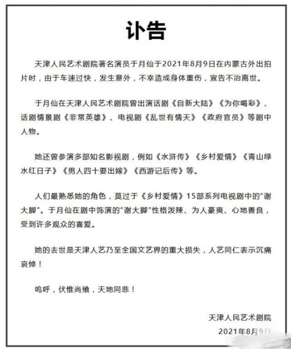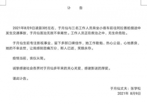 于月仙的丈夫张学松在讣告中写道:“于月仙生前专注影视事业,留下多部口碑佳作,她工作勤勉,热心公益、心地善良,她的不幸去世,让我感到悲痛万分,斯人已逝,笑貌永存”,并透露因为疫情,于月仙的丧仪将从简处理。