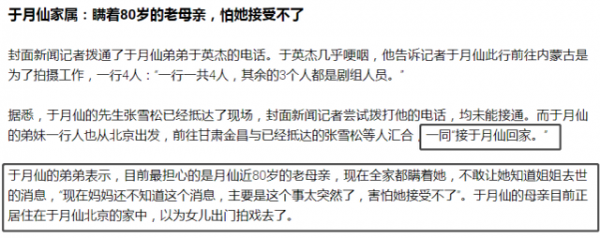 于月仙的母亲近80岁,于月仙的弟弟透露,现在全家都在瞒着母亲:“现在妈妈还不知道这个消息,主要是这个事太突然了,害怕她接受不了”,母亲也以为于月仙出门拍戏去了。
