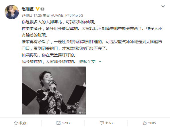 赵本山的女儿赵珈萱宣布暂停直播的同时,也在微博发文悼念于月仙,赵珈萱称很多人都叫于月仙大脚婶,只有她叫她仙姨,赵珈萱在微博中非常悲伤的写道:“你匆匆离开,象牙山会很寂寞的”“仙姨再见,你在天堂要好好的。我会想你的,大家都会想你的”。