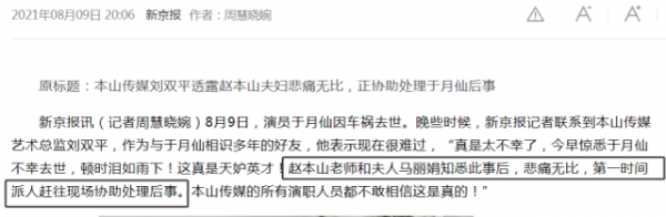 据媒体报道,赵本山和妻子马丽娟得知于月仙发生车祸去世的消息后,同样悲痛无比,已经第一时间派人赶往现场协助于月仙家人处理后事。