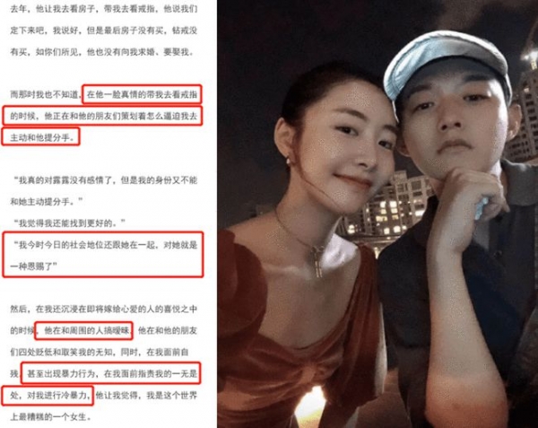 而在陈露的长文叙述中让人心疼的是,去年霍尊和陈露表示要带她看房子戒指,打算把两人的事情定下来。然而在陈露满心欢喜的时候,霍尊却在和朋友们策划怎么逼迫她主动提分手,甚至说出“我今时今日的社会地位还跟她在一起,对她就是一种恩赐了”这种话。