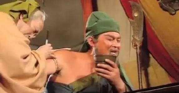 当时,关羽和马良在下棋,一边喝着小酒,谈笑自若,和没事人一样,华佗割开了关羽的右臂,用刮刀一点点的刮毒,发出了一阵阵滋滋的声音。