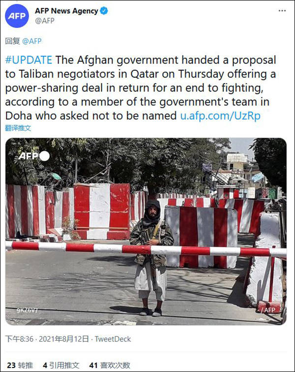 另据法新社12日援引一名阿富汗政府消息人士的话称,在卡塔尔进行谈判的阿富汗政府已向塔利班提出一项协议以分享权力(power-sharing),换取该国暴力活动的终结。
