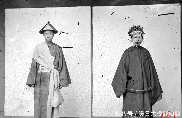 清朝男人在结婚这一天可以穿官服,不管你有没有功名;新娘则凤冠霞帔,千娇百媚。这位新娘也是不裹小脚的,穿着登云履(裹脚妇女则穿弓鞋)。