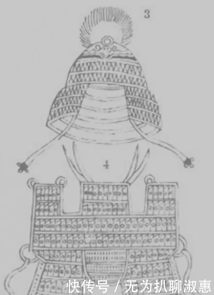 而从步人甲的身甲插图来看,步人甲身甲上半部,打开像一个山字形。其中间的部分有四根带子,两侧各有两个圆环,两侧也有两根带子。很明显四根带子是肩带,因为盔甲很重,直接用两根肩带会很勒,所以用了四根肩带,可以减小压强。腰部的两根带子,负责腰部的固定,缓解肩部的压力,毕竟这种扎甲虽然是编织的,但还是有一定支撑性的。至于腿部的防护,则靠甲裙。其可以根据需求,决定是防护到膝盖还是脚踝部位。甲裙虽然有缝隙,但是可以参看下图,用腰部护甲盖住。基本上,这套甲在头颈躯干算得上密不透风了。
