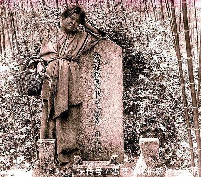 图中是一名清朝时期的女子,女子站在一个墓碑前,从墓碑下面的香炉和香炉两侧的摆设看,这个墓应该属于那种有钱人家的墓,图中的女子穿着邋遢,不知道和这个墓的主人是什么关系。