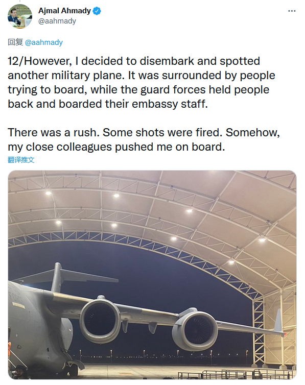 艾哈迈迪表示,自己没能坐上所购买的航班,但意外被同事推着登上了另一架军机。他还强调自己随身没有携带任何资产,脚上的鞋都被挤掉了一只,“军机被试图强行登机的人包围,警卫部队最终阻止了他们登上这架坐满了大使馆工作人员的飞机。在混乱中有人开了几枪,不知何时我的同事把我推上了飞机。”