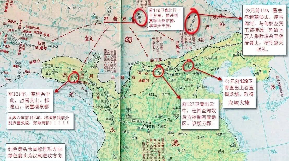 汉武帝刘彻决定放弃和亲政策,进行正义的抵抗。在西起河套,东至辽西的广大地区,同匈奴进行了长达10余年的战争。其中规模最大的一次,是公元前119年,卫青、霍去病领导的漠北之战。